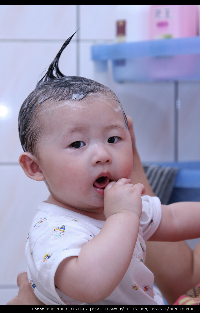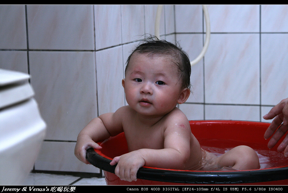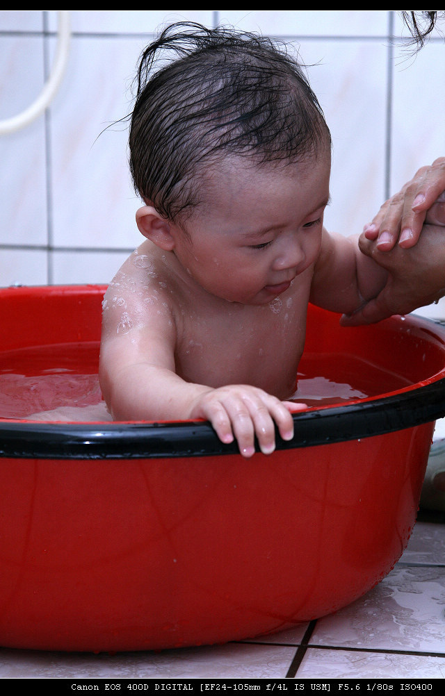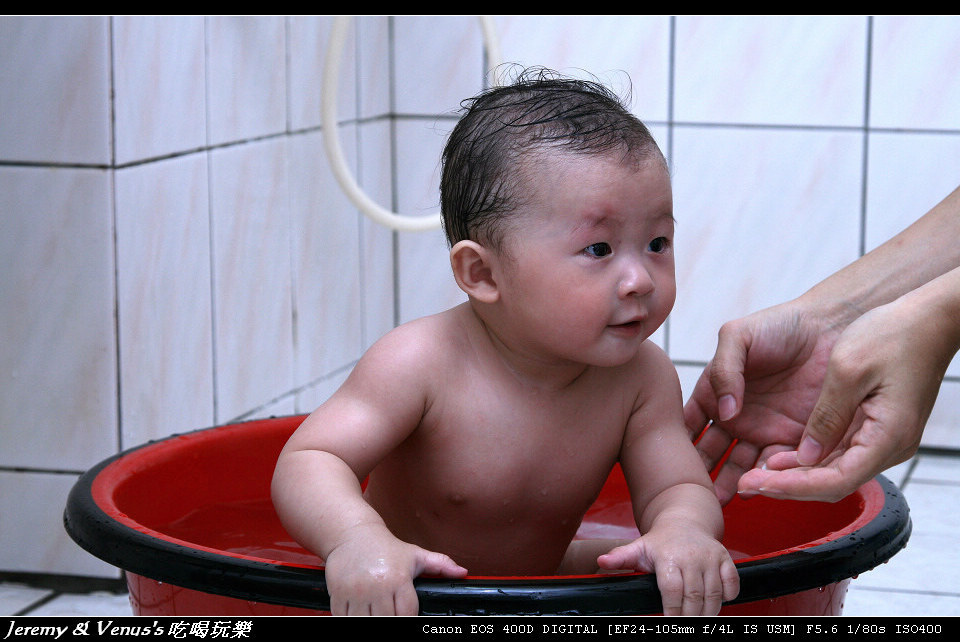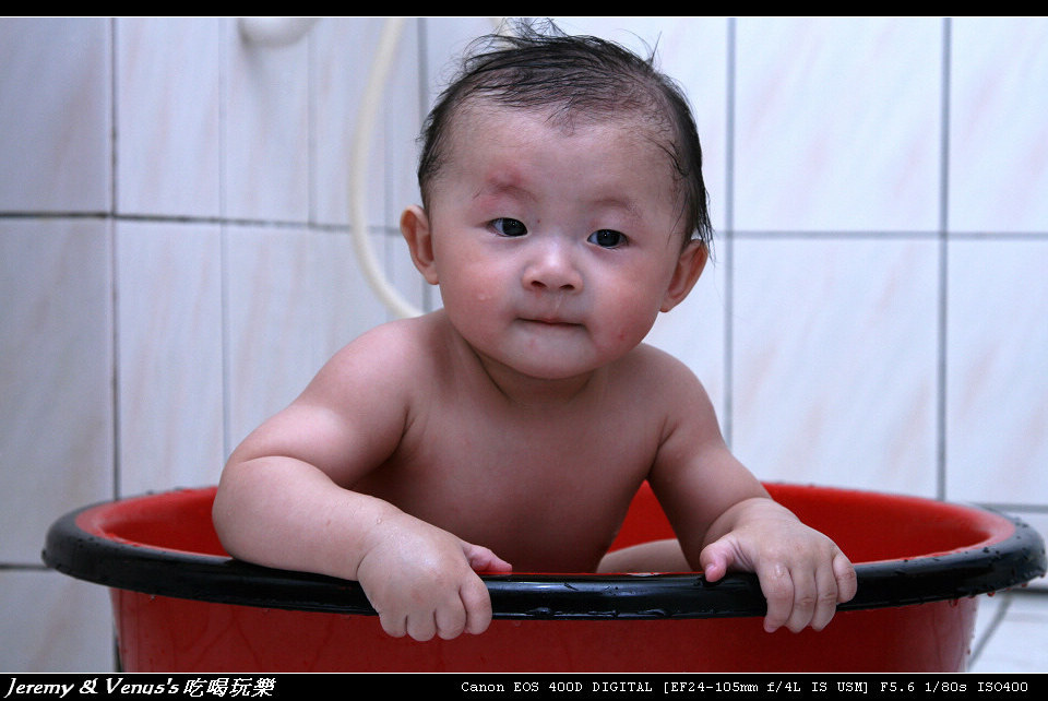 我們平常幫小孩洗澡都是一個人洗一個人抓著她,不過這次為了拍照,稍微離開了一點點就摔出來了,所以幫小孩洗澡一定要注意她的一舉一動喔。