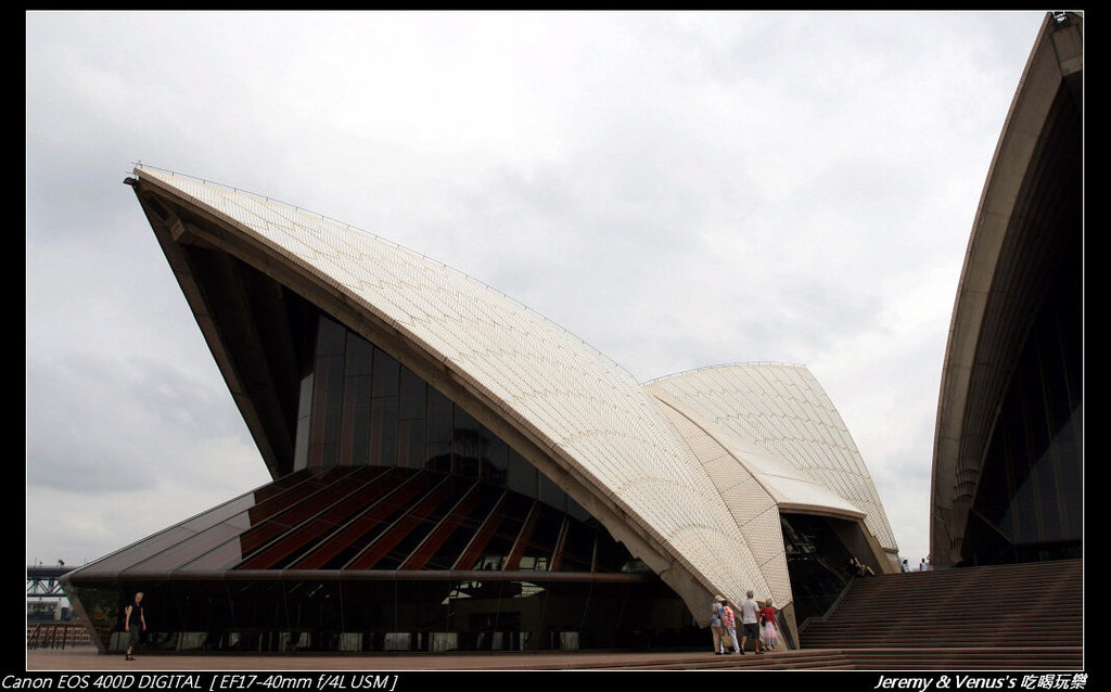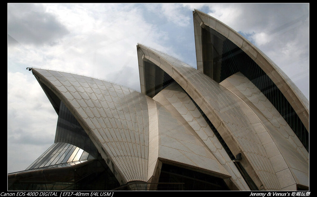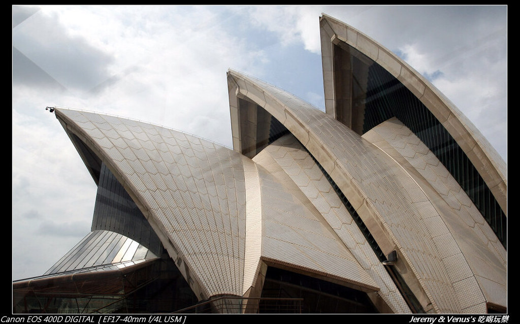 雪梨歌劇院,是澳洲最具代表性的地標建築,奇特的造型,曲折的建造過程及內部建材的選用,都是之所以獨一無二的原因,襯著背後的藍天極大海,是許多遊客攝影取景的地點。可惜很不幸的,我們又遇到不是很好的天氣,雖然沒下雨,雖然有太陽,可是,你看看: