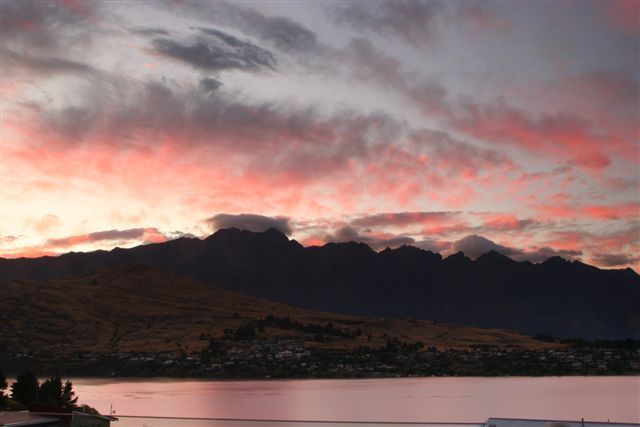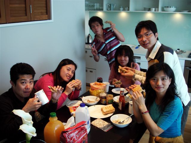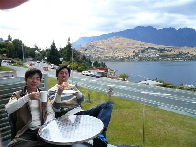 拖呀拖,八點才將大家給挖起來,再拖呀拖,九點才吃早餐,真是散漫的旅行團,窗外就是Lake Wakatipu瓦卡提波湖,環境氣氛如此幽美,邊吃早餐邊欣賞美景真是一大享受,不怕冷的也可以到陽台上去吃,雖然每天的早餐都大同小異,不過大家還是吃得很快樂。