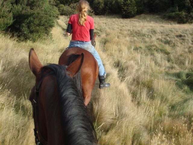 整趟路程不斷的在草原、小山丘與樹林間穿梭,有上坡也有下坡,因逢秋天,山丘上長滿了菅芒草,看起來真的有在拍電影的感覺,雖然沒有涉水過溪,但感覺此路線似乎比較好,以往在台灣騎馬都是教練牽著讓你在馬場裡繞一圈,第一次沒人牽自己操控馬匹,滿新鮮的,雖然不用指揮,馬兒自己會跟著教練走,但還是很刺激,不過在馬上要照相著實不方便,所以大家都是互相幫別人拍,反正最後大家的照片都會流通,不必在乎是誰的相機拍的。教練說一開始馬兒會先試探騎馬的人是不是新手,牠會試著去吃草,看你會不會阻止牠,如果你放任牠去吃,那牠就不太會聽你的話不受你控制了,所以當馬兒想去吃草時要把牠拉回來不讓牠吃,我的馬比較可憐,一開始就被我拉的死死的,哪都不能去,不過女生的力氣沒有馬兒大,大多拉不過牠,像Venus的馬兒常常脫隊不受控制,離大家遠遠的,讓Venus騎得怕怕的,我看了也膽顫心驚,只好跟在她後面走。