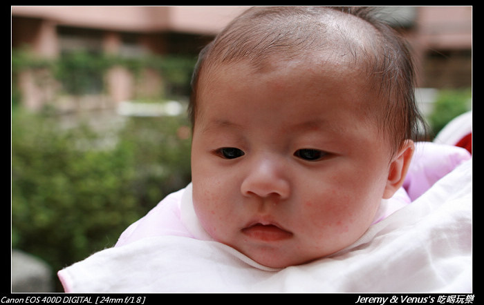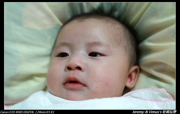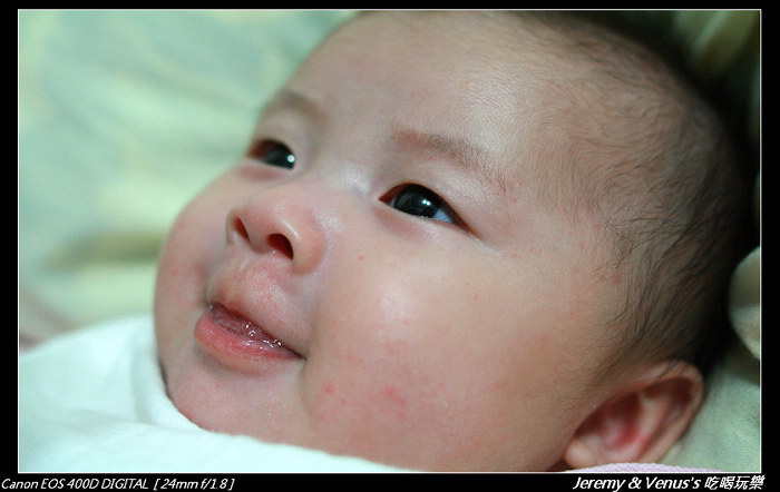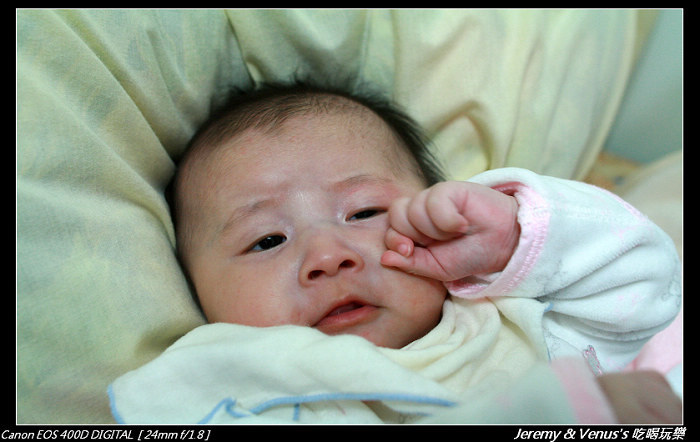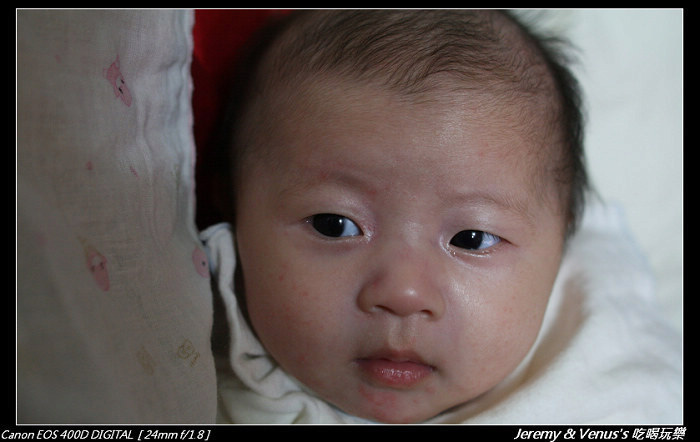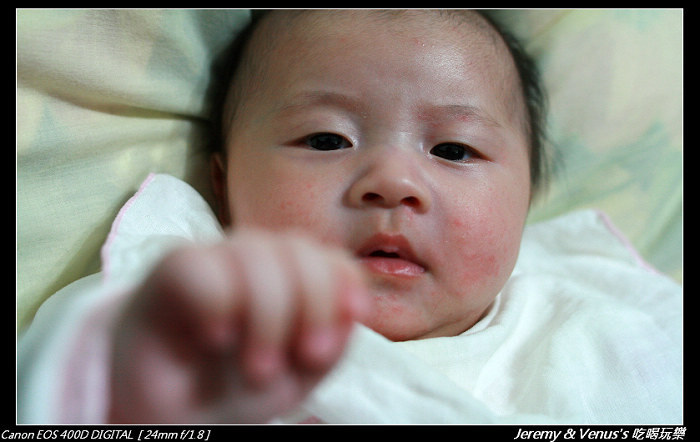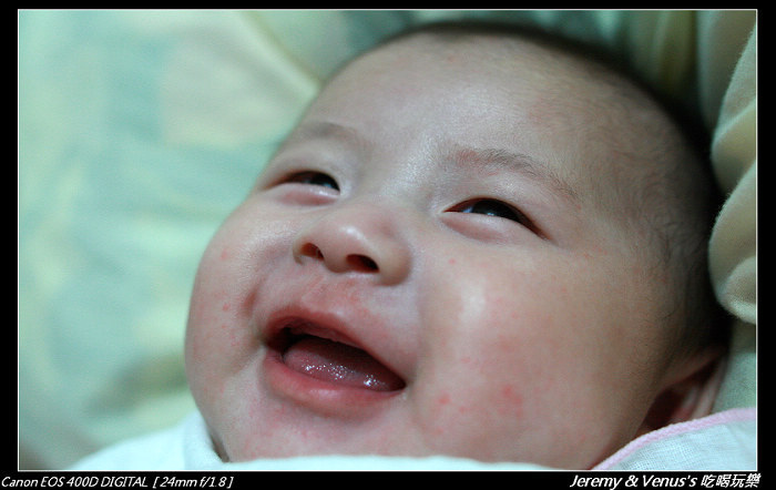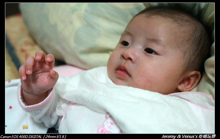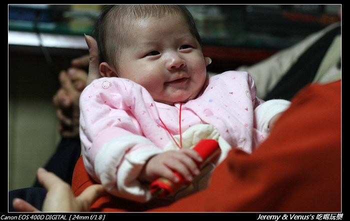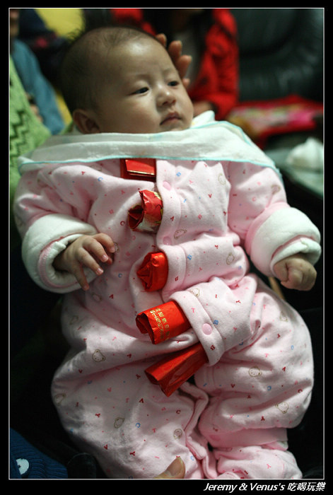 很快的小宸宸出生到現在已經過了三個月,現在她的生活步調都已經固定了,二月三日去打預防針時量的體重是5.9公斤,目前一天只有喝四次,每次喝配方奶大約150 CC,母乳大約200 CC,喝奶與睡覺時間都可以固定,每天早上九點、下午一點、六點、晚上十點共四次,最後一次喝完奶之後約晚上十一點入睡便可一覺到明天早上九點,很多人會問怎麼會這麼好睡,晚上都不會吵著要喝奶嗎?因為她白天都不睡覺,而且不睡覺時一定要有人陪,即使有睡也頂多小睡個半小時不到就醒來哭著找人,也就是說白天得一直陪著她,雖然累人,但能換來大人們的一夜好眠也是值得的。脖子已經硬挺,完全不需要護著,但還是得小心突然的搖晃。開始對周遭事物產生好奇,想睡時會哭鬧,大概就這樣,還有就是過年她領紅包領的倒是滿開心的~