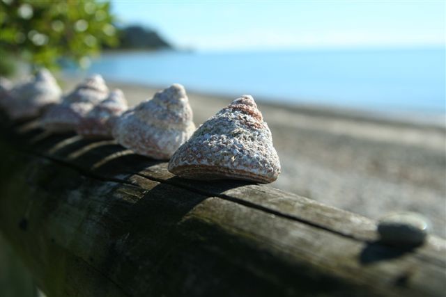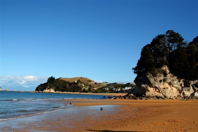 稍後,告別了陳教授及師母,驅車往上探尋農場前那條小溪的源頭,就在農場外頭的道路往上開一小段路就到了,下車再走個五分鐘就看到一處水池洞穴,清澈見底,水深達六公尺,據說潛水游進水洞裡會到達一處鐘乳石洞,當然我們不會真的游進去看看,水很冰ㄟ!沿路還有一些顏色鮮豔的菇類,像極了馬利兄弟裡的香菇。之後車子就開往Kaiteriteri這個地方,這是一處海邊,我們叫它黃金海岸,因為這裡的沙子不是一般的土黃色,而是像黃金般的金黃色,大夥們鞋子一脫就往海邊跑去了,不過在跑之前,先把剩下的團費繳一繳吧,雷蒙跟四喜兩人收錢收的可真爽,大家在這邊開心的玩耍拍照,旁邊還有個小山丘可以俯瞰整個海灣,也看到海灣旁的一些海景豪宅,房子前面還有私人沙灘咧,真想移民來紐西蘭住,夕陽西下,也該回去了。