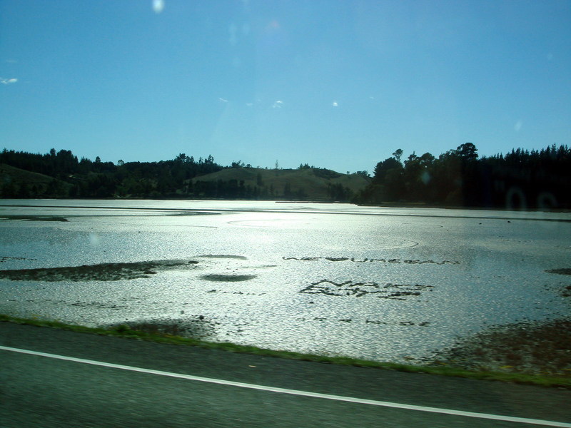 今天的目的地是陳教授的有機農場,陳教授及師母兩人都是台大的退休教授,一個是動物系,一個是植物系,配合經營農場剛剛好,不過在此之前,我們先到了一處海灣,自己取名為藍寶石海灣,為什麼叫藍寶石呢?因為海面在陽光著照射下呈現藍鑽般的光芒,拍拍照後繼續上路,這時我發現到幾個特別的東東:紐西蘭跟日本一樣都是右駕駛靠左行駛,不過紐西蘭因為人少,除了人口較多的大城市像是基督城之外,一般市區裡的十字路口都會做成圓環狀來取代紅綠燈,在那爾遜開一段十分鐘的路大約會遇到四五個圓環,繞的昏頭轉向,既然沒有紅綠燈,守法精神就很重要了,所有車輛必須繞圓環行駛再行轉彎或直走,而且重點是無條件得讓右邊的車輛先行,只要你的右手邊有車輛來,你都得讓他先過,而且不能搶先,也不能趁兩車之間有空隙就插進去,必須等右邊的車都走完了或是下一車還很遠的時候你才走,更厲害的是大家都很守秩序,在台灣有可能做的到嗎?別傻了,況且台灣地峽車多,不可能這樣等的,除非想讓馬路變成停車場。另一個更奇特的,昨天在海邊有看到類似瀉湖的沼澤地,現在在路邊也有看到,不過奇特的是又沼澤水面上有人在上面寫字,就好像你在沙地上寫字一樣,問題是字的周圍沒有腳印,也沒有船划過的痕跡,那到底是怎麼寫上去的?就像照片上那樣,方法是有啦,大家想想吧。中途休息了一次上廁所,那爾遜是紐西蘭的藝術重鎮,連廁所都弄得很有藝術氣息。上路後再開沒多久就到了陳教授的有機農場了。