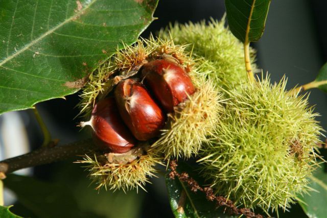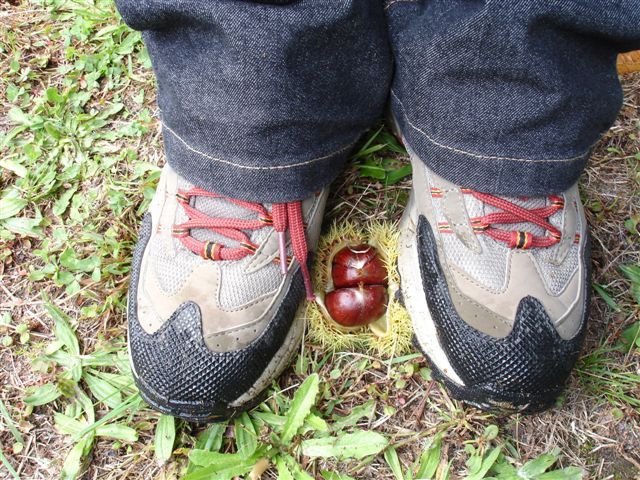 管他的,反正農場裡看的到的都可以吃,不過要吃得自己動手,第一件事先去摘栗子,栗子是長在樹上的,可是栗子果實的外殼上有很尖銳的刺,就像海膽一樣,不小心點拿是會被刺傷的,得用長竹竿將已經熟了的栗子打下來再去撿,然後用腳撥開再將裡面的栗子果實取出,我們摘了一大袋,這是飯後甜點要用的,不過”人有失蹄馬有失足”,受傷在所難免嘛。