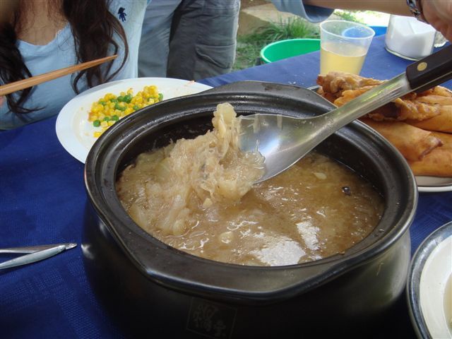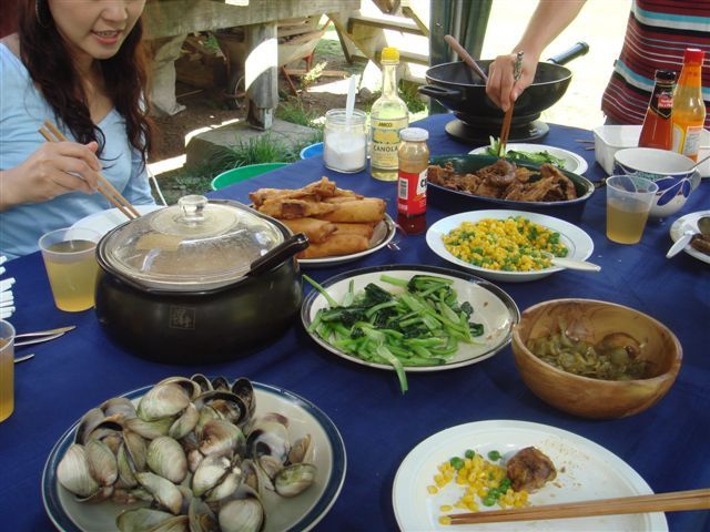當然還有最辛苦的師母,在廚房裡張羅我們午餐的其他餐點。大家都處理完畢後,午餐也差不多上桌了,不過還有一件事要做,就是自己煎蚵仔煎,蚵仔也是陳教授去海邊撿來,師母自己撥殼的,雞蛋是剛剛去雞舍偷來的,青菜是剛剛自己摘的,不過要吃得自己動手做,陳教授先示範一次,步驟很簡單,有吃過的應該都會,不過很奇怪的是我們這一團掌廚的都是男士,還好大家做的都可以吃,師母煮的菜也一一端上桌,有炸南瓜、炸春捲、三杯雞、醃小黃瓜、炒青菜、炒玉米豌豆、鮮蒸蛤蠣、魚翅瓜羹湯、炒栗子、自釀金桔檸檬汁等等,滿滿一桌,除了海鮮之外,所有食材都是出於自家農場,其中有一項你也會問說那是什麼吧?那是魚翅瓜羹湯,那是什麼?那是一顆長的像是西瓜的東西煮出來的,因為煮出來很像魚翅,所以叫他魚翅瓜,沒看過沒聽過吧?