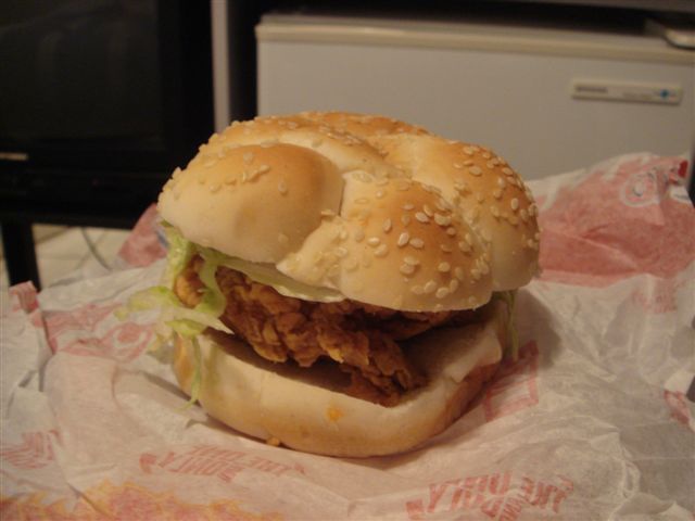 晚餐又是經由大家討論票選出結果,就是去買明星牌超級大漢堡回去吃,為什麼叫明星牌大漢堡呢?因為他們裡面的漢堡名稱都是用當紅的明星名字,份量其大無比,因為雷蒙說真的很大,所以大夥們都是兩人買一個而已,在等待的同時順便跑到隔壁的超市買些零食,我們又買了一碗泡麵1.29元、兩杯優格1.1元(真便宜)、一包洋芋片1.99元,回來時漢堡也好了,大家帶著晚餐回旅館去享受了。打開盒子發現,真的是滿大的,大約是手掌張開後的大小,直徑大約15公分,一吃又發現,真的很好吃,我從來沒有吃過那麼好吃的漢堡,大雖大,不過因為很好吃,兩個人吃根本不夠,雷蒙四喜回去了,沒辦法再去買,怎麼辦?肚子填不飽,於是跑到旅館旁邊的肯德雞去買漢堡吃,店面裝潢跟台灣的都一樣,人還滿多的,要排隊,經過一陣雞同鴨講+比手劃腳之後,我們只單點一個卡啦雞腿堡,小小一個,咬了一口之後,挖靠,紐西蘭肯德雞的漢堡,還真是超級難吃,雞腿肉乾巴巴,麵包又冷又乾,一個還要5.5紐元,比起剛剛的明星牌大漢堡一個7.5紐元,真是差太多了,算了,還好我還有買泡麵跟零食,不過泡麵也普普,看來只有日本的泡麵比較好吃,昨天的冰淇淋還沒吃完,再努力吃一點,還是吃不完,繼續冰,明天還有一天。