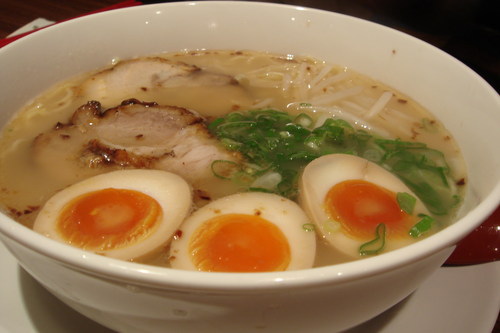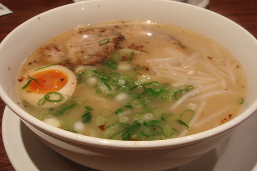 這邊的拉麵口味就只有一種,就是牛骨白湯拉麵,雖然菜單上還有其他的,不過就只是這一碗的延伸,像是VENUS點的半熟蛋牛骨白湯拉麵,就只是我的這一碗再加上兩顆一半的半熟蛋多20元: