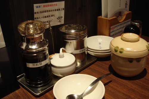 菜單就在桌上,另外還有一些調味料,特別的是蒜末,那是炒焦後的蒜末,不過大多是用來吃肉時配的,這邊推薦你加到湯裡面,怪怪的,等等再來嘗試看看。