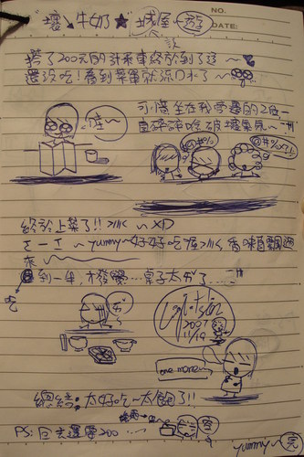 每個桌上還放有一本筆記本,可以讓客人隨意留言,我們這一本上面有很多人留言,有人說叉燒飯好吃,有人說黃金炒飯量太少,有人說旁邊的客人太吵.......,不過我發現一篇很有趣的留言加插畫:
