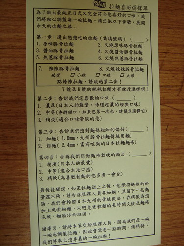 坐下後先上兩杯溫麥茶,點單通通自己來,可選擇口味、湯頭濃淡程度、麵條粗細、麵條軟硬度。