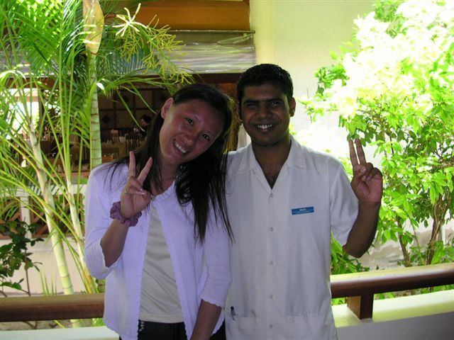中午一點半的船班前往 Kurumba ,所以上午我們便整理整理行李,之後去水上屋那邊看看那無緣住到的水上屋,中午用餐完後跟服務我們兩天的服務員拍個照做紀念,